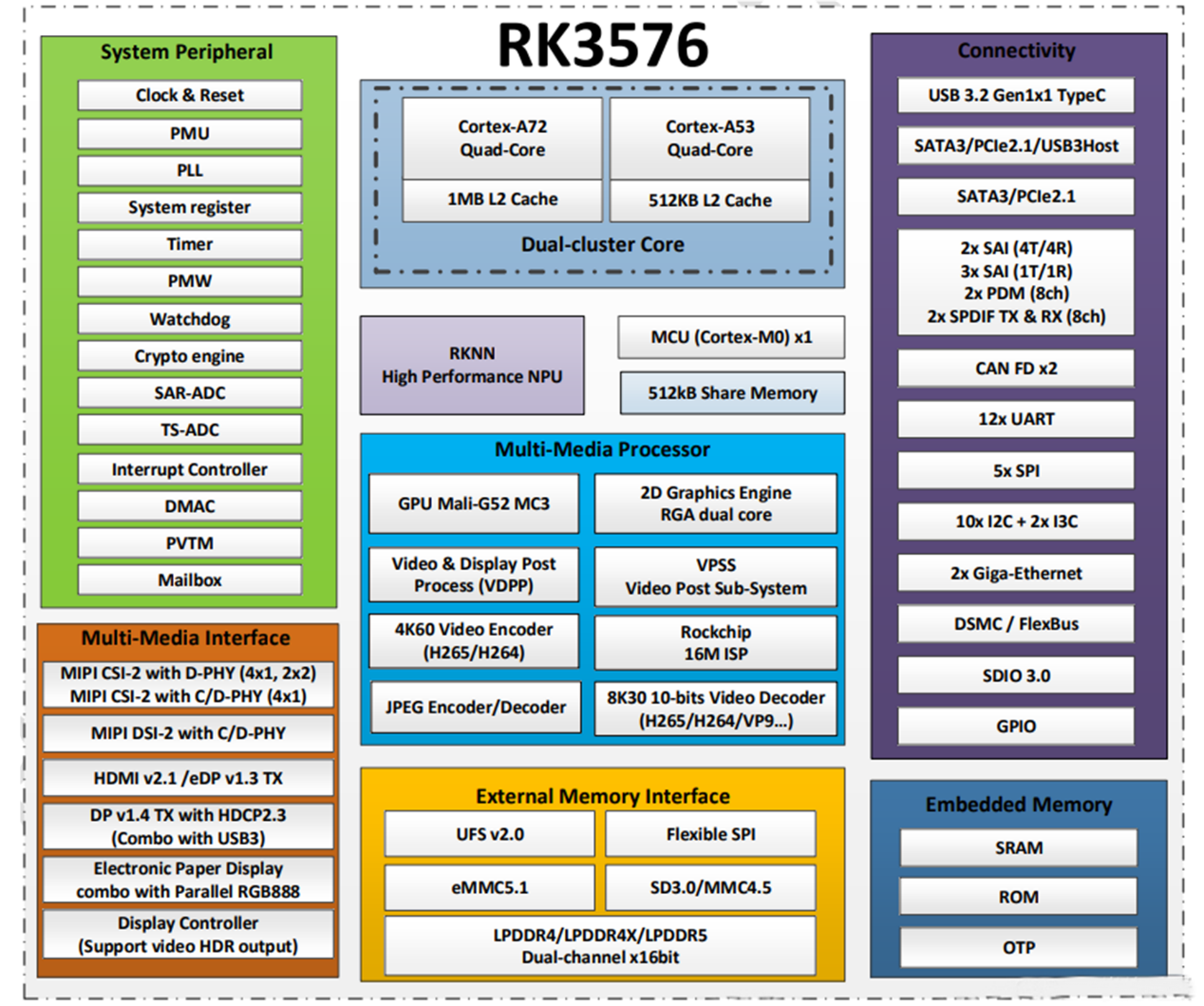 RockChip RK3576 Druga generacja 8m wysokowydajna platforma AIOT to wysokowydajny procesor SOC o niskiej mocy (system-on-chip) odpowiedni do różnych scenariuszy aplikacji, takich jak komputery oparte na ramieniu, urządzenia komputerowe i osobiste urządzenia mobilne. Wykorzystuje ośmiordzeniowy procesor oparty na architekturze ARM, integruje niezależne 6TOPS (operacje TERA na sekundę) NPU (jednostka przetwarzania czterokrotnego sieci neuronowej), integruje wiele rdzeni obliczeniowych, takich jak GPU, MCU, VPU, i ma bogaty interfejs peryferyjny, aby spełnić złożone wymagania sceny w ALOT. Ponadto RK3576 obsługuje również pamięć UFS (Universal Flash Storage), zapewniając wydajne możliwości przechowywania danych i czytania.