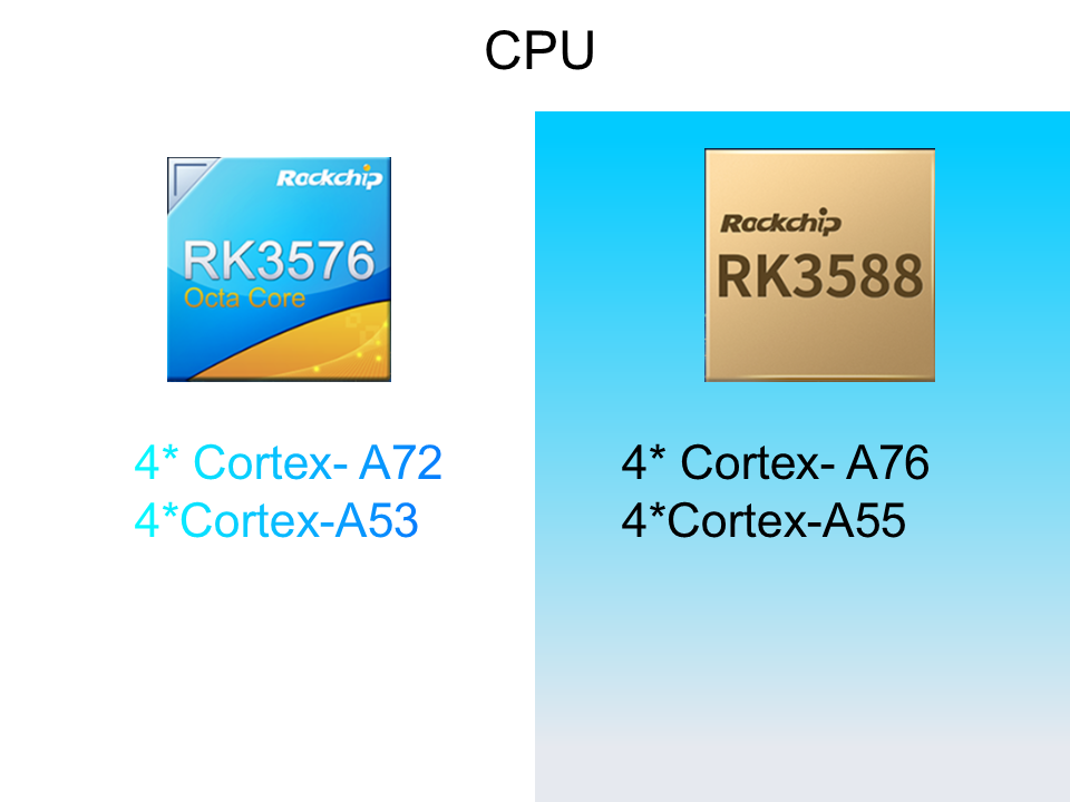 Wydajność procesora: RK3588 wykorzystuje czterordzeniową kory Cortex-A76 + czterordzeniową kory-A55, podczas gdy RK3576 używa czterordzeniowej kory kory72 + czterordzeniowej architektury kory kory-A53 do względów kosztów i jest wyposażona w koprocesor kory M0 ramię M0, co wprowadza więcej możliwości do powiązanych aplikacji.