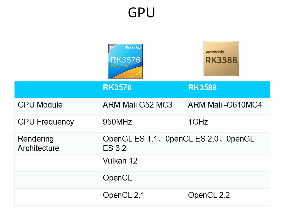 Obaj obsługują OpenGL ES 1.1, 2.0 i 3.2, Vulkan 1.2, ale RK3588 jest wyższy w wersji OpenCL (RK3588 obsługuje 2.2).