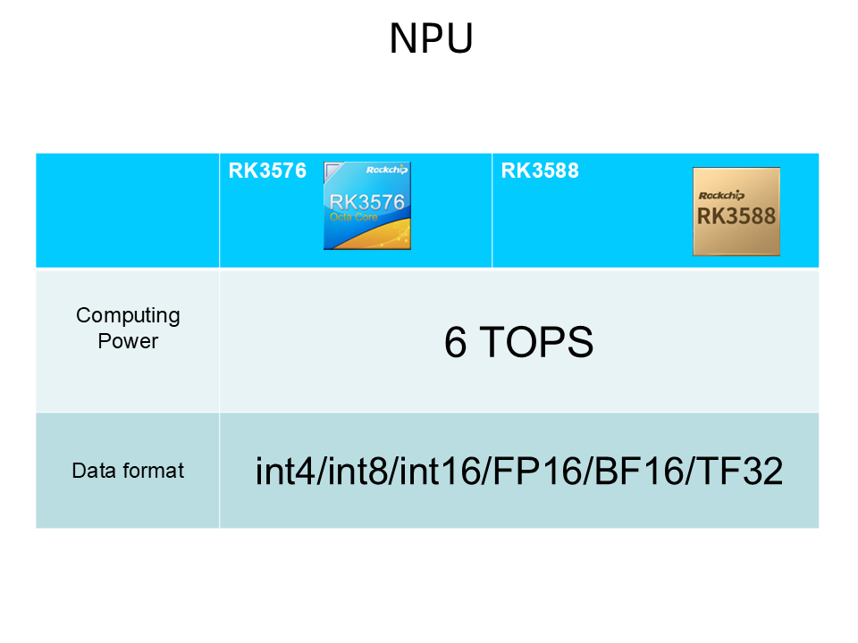 RK3588 i RK3576 są wyposażone w 6 TOPS Power obliczeniową, formaty danych obsługi, takie jak Int4int8/Int16/FP16/BF16/TF32 i są odpowiednie do różnych aplikacji AI AI scenariusze.