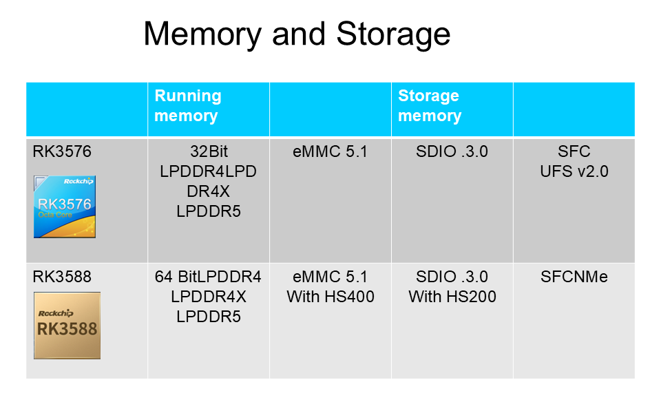 RK3588 Obsługa64-bitLPDDR4/LPDDR4X/LPDDR5, EMMC5.1: Z HS400, SDI03.0 z HS200 oraz NME i SFC. Oba są różne w pamięci szerokość bitów danych (64 -bit vs. 32 -bit).