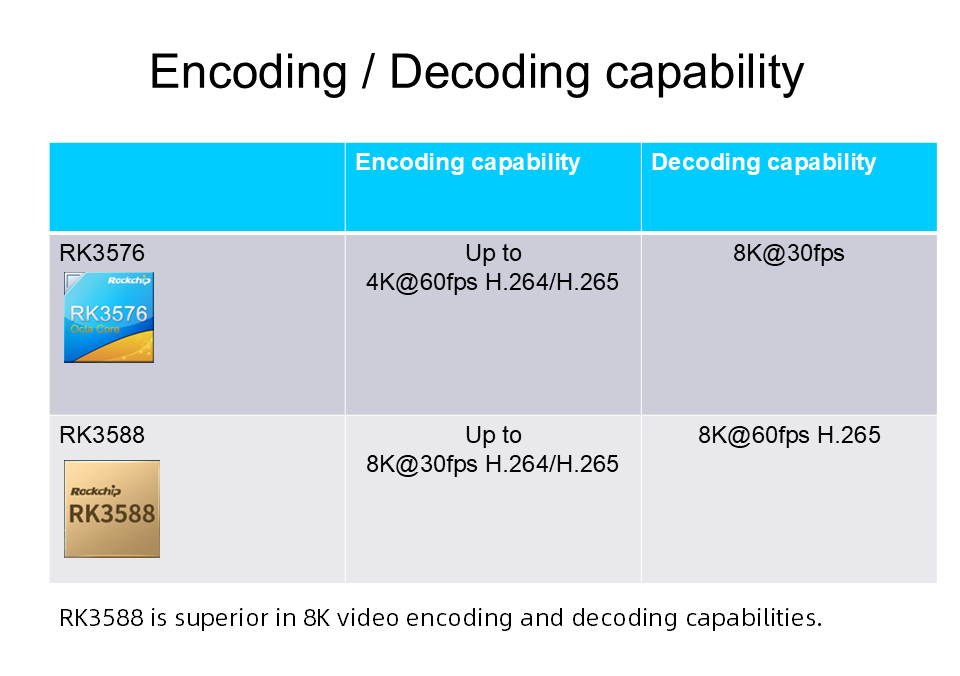 RK3588 obsługuje do 8k@60fps H.265, a RK3576 obsługuje do 8k@30 klatek na sekundę.