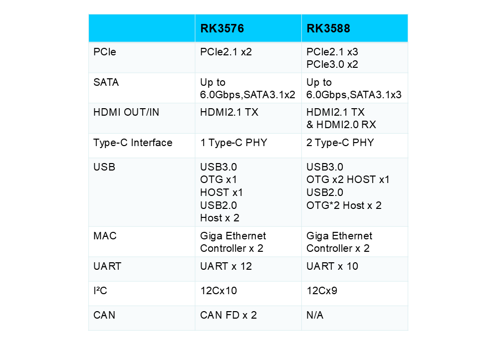 Zarówno RK3588, jak i RK3576są wyposażone w konfiguracje bogatych interfejsu, w tym PCIE/ SATA/ Typ C/ USB3.0/ USB2.0/ Dual Network Porty/ wiele portów szeregowych, aby spełnić różne wymagania dotyczące aplikacji produktu.