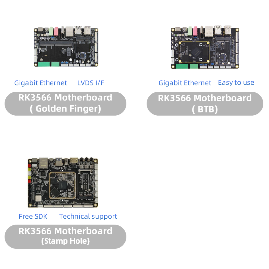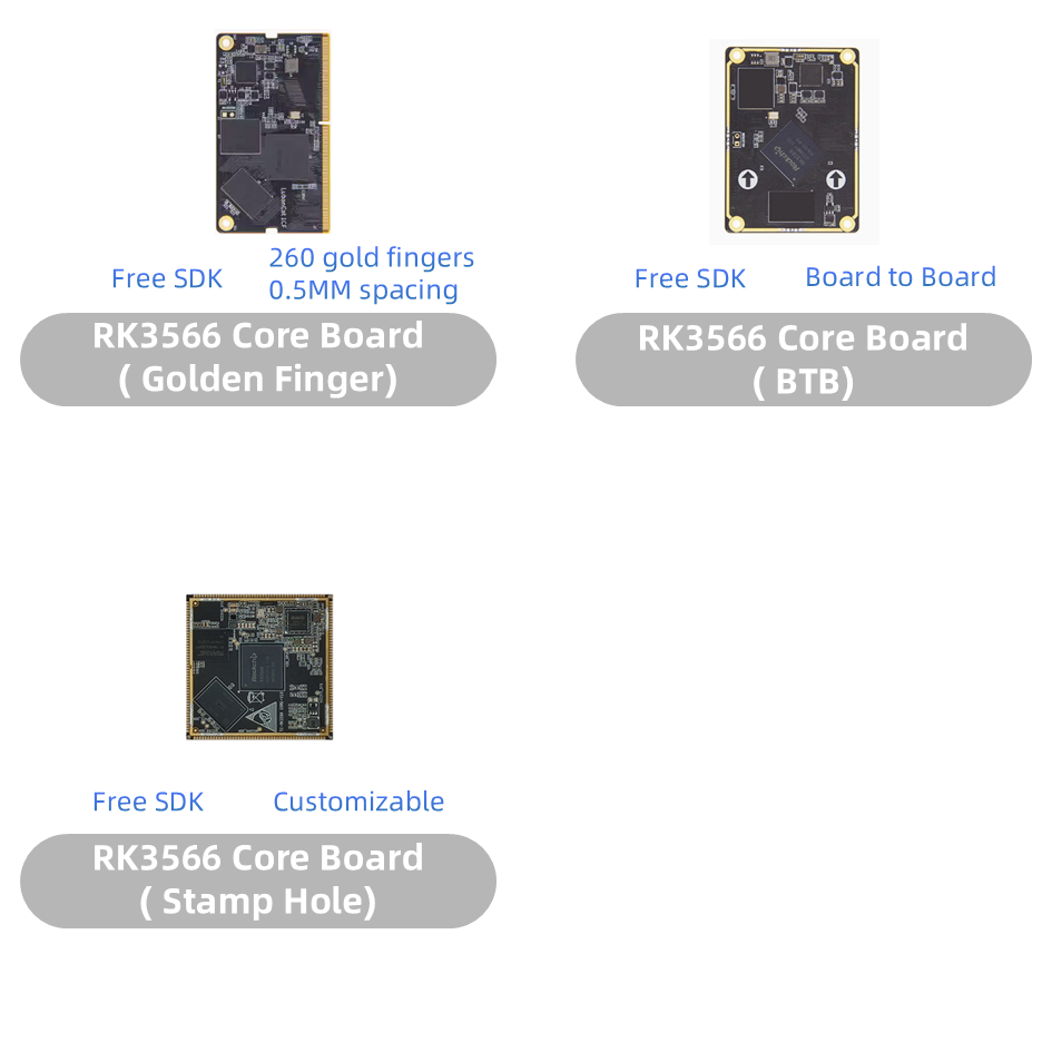 Opracowaliśmy 3 różne podstawowe płyty, to: RK3566 Stamp Hole Core Board, RK3566 Golden Finger (podobny do SMARC) Core Board i RK3566 BTB (Board to Board) Core Board.