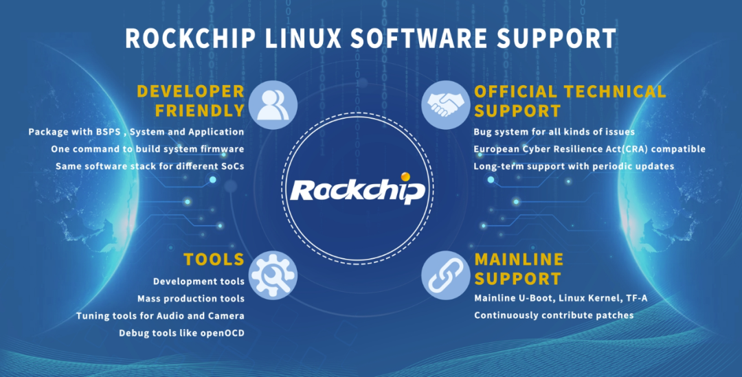 RockChip zapewnia kompleksowe obsługę zapewniania oprogramowania, a platforma chipów głównego nurtu nadal aktualizuje i dostosowuje się do najnowszych wersji systemu Linux i Android, zapewniając pakiety oprogramowania zintegrowane BSP, systemu i aplikacji dla globalnych programistów. Partnerzy i deweloperzy w różnych dziedzinach mogą uzyskać wsparcie techniczne dla wszystkich rodzajów problemów oraz różnych narzędzi rozwojowych i debugowania na oficjalnej platformie RockChip. Jeśli chodzi o wsparcie bezpieczeństwa, RockChip zapewnia kompleksowe mechanizmy bezpieczeństwa, takie jak bezpieczny BEZPUSKI SELOTBOOT, TrustZone, szyfrowanie i deszyfrowanie silnika, aby zapobiec manipulacji integralności oprogramowania układowego.