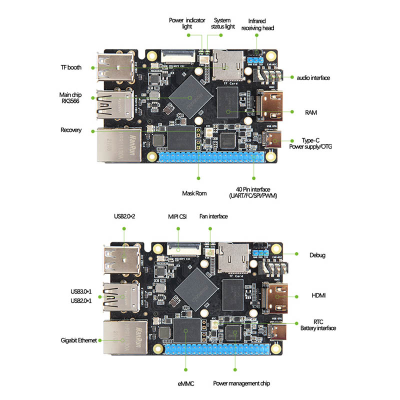 RockChip RK3566 jest stosowany jako główny układ, 22NM Process Technology, główna częstotliwość 1,8 GHz, zintegrowany czterordzeniowy 64-bitowy procesor Cortex-A55, grafika MALI G52 2EE.